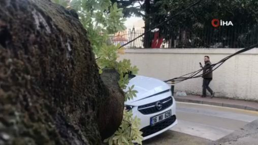 Bursa’da gün boyunca etkili olan şiddetli lodos, sabaha karşı bir ağacı ve elektrik direğini araçların üzerine devirdi.