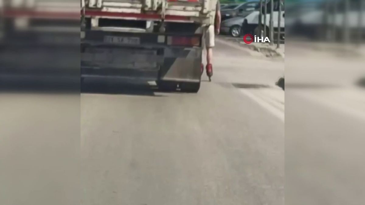 Bursa'da kask ve koruması olmayan patenli genç, anayol üzerinde seyir halindeki kamyona tutunarak ilerledi.
