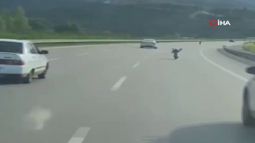 Bursa'da iki kafadar arkadaş otobanda motosikletin üzerine uzanarak seyrederken o anlar başka bir sürücünün kamerasına yansıdı.