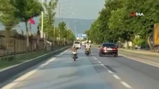 Bursa'nın İnegöl ilçesinde üzerine yattığı motosikletlinin tehlikeli seyrettiği anlar amatör kameraya yansıdı.